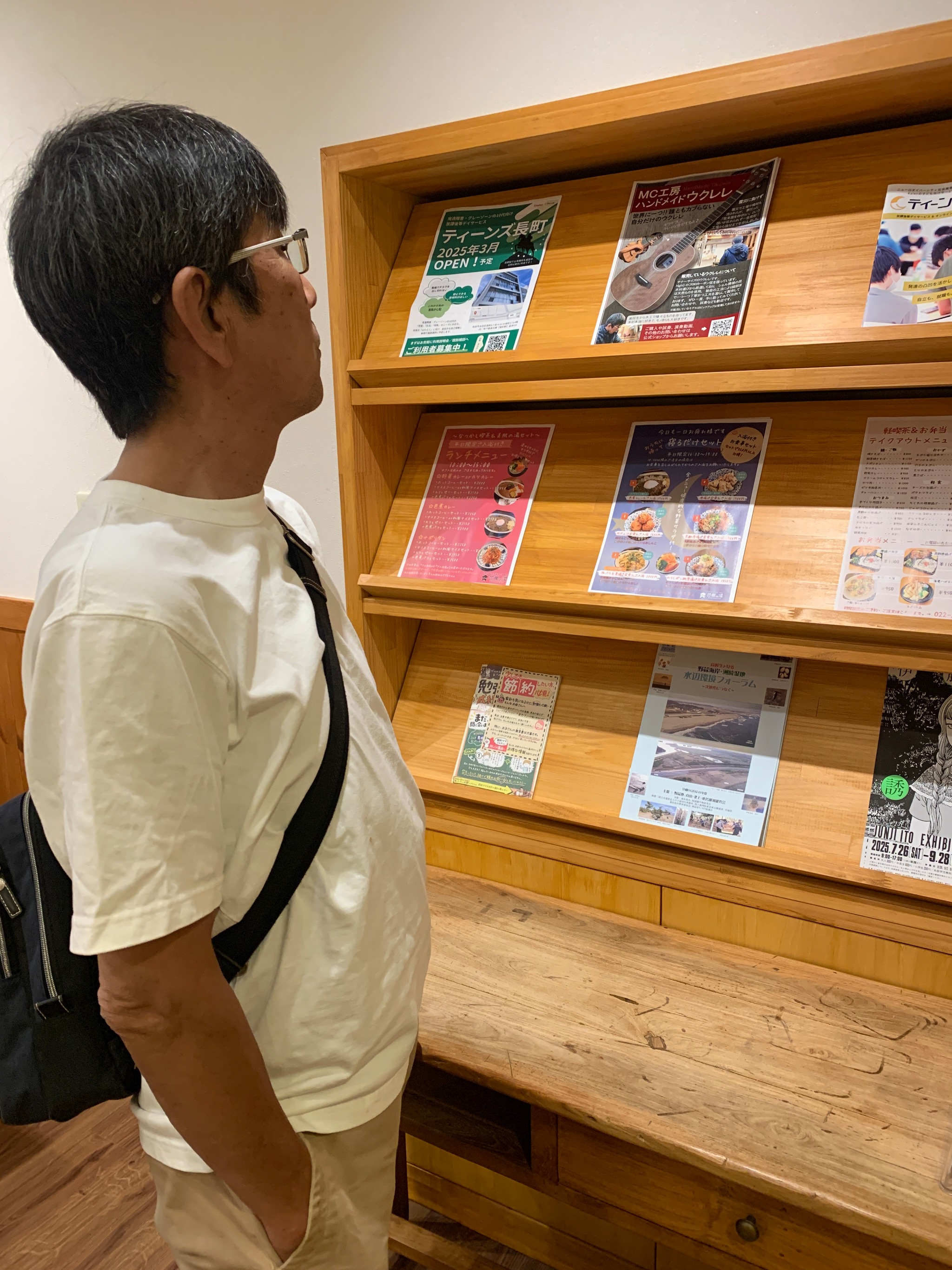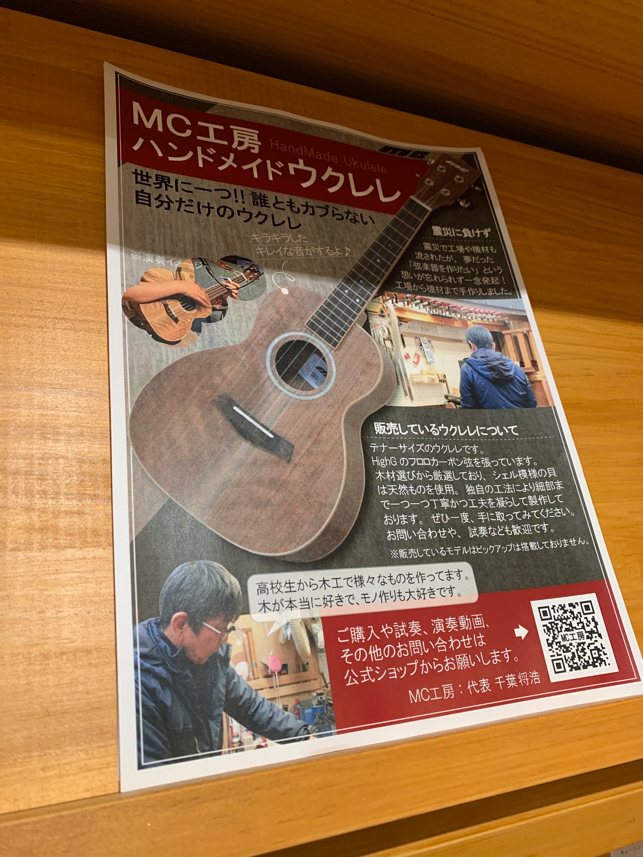 こちらの棚に、当工房の制作するウクレレのチラシを置かせていただきました!